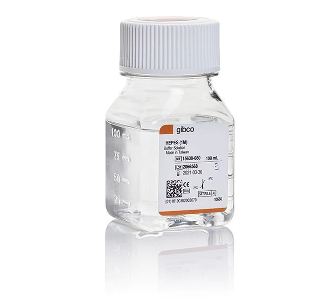 Gibco? HEPES(N-2羥乙基哌嗪-N-2-乙烷磺酸)是一種兩性離子有機化學緩沖液,常用于細胞培養基中。當需要在 CO2 培養箱外長時間處理細胞培養物時,添加 10–25 mM HEPES 可提供額外的緩沖能力。HEPES 具有膜不透性、對生化反應的影響有限、化學和酶學穩定性、極低的可見光和紫外光吸光度等優點,因此是許多細胞培養系統的良好緩沖選擇。